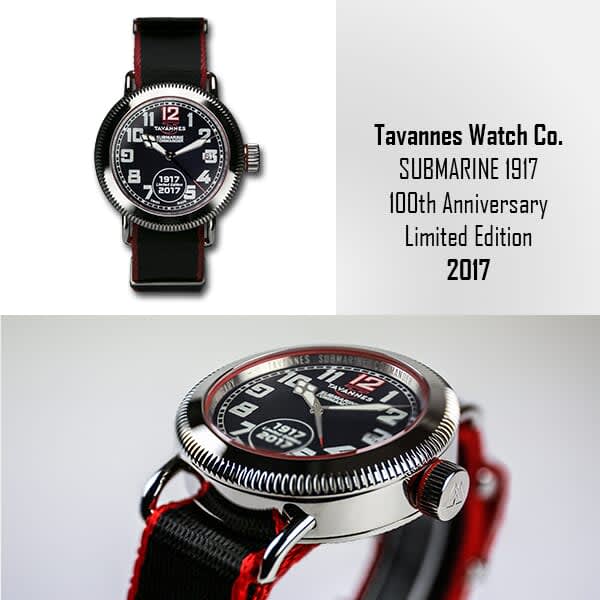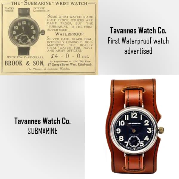 During WWI, the Tavannes Watch Co was approached by two British submarine commanders to consider the construction of a watch suitable for work on submarine decks awash in water - This watch was supposed to be water-tight, non-magnetic, and the balance wheel had to be of a material which shows a minimum of expansion and contraction with variations in temperature - The face had to be legible at all times - In 1917 was born the first waterproof wrist watch made by the Tavannes Watch Company.