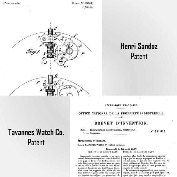Henri-Frédéric Sandoz was a prolific inventor. Between 1889 and 1907 he registered 39 patents for improvements to watches in his own name, and a 11 more were registered by the Tavannes Watch Co. SA under his direction before his death in 1913.