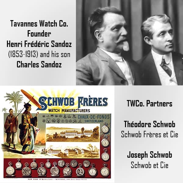 In 1891 a young, talented master watchmaker, Henri-Frédéric Sandoz, founded the Tavannes Watch Company in a small Swiss village, Tavannes, in the Jura mountains. He and his partners, Schwob Frères, soon opened markets around the world, notably in Canada, Russia, United States, and the Far East.