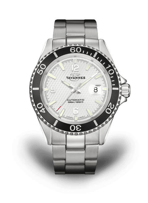 This Tavannes men’s watch features a unique white CARBON dial with luminescent Superluminova applied to the indexes and hands, a stainless steel case, a black rotating bezel, a magnified date display at 3 o’clock, scratch resistant and anti-reflective sapphire crystal, screw-down crown, a stainless steel bracelet with security buckle and extension for a diver’s suit, a Swiss Quartz movement for unsurpassed precision, professional water resistance to (20 ATM / 200 meters / 660ft).