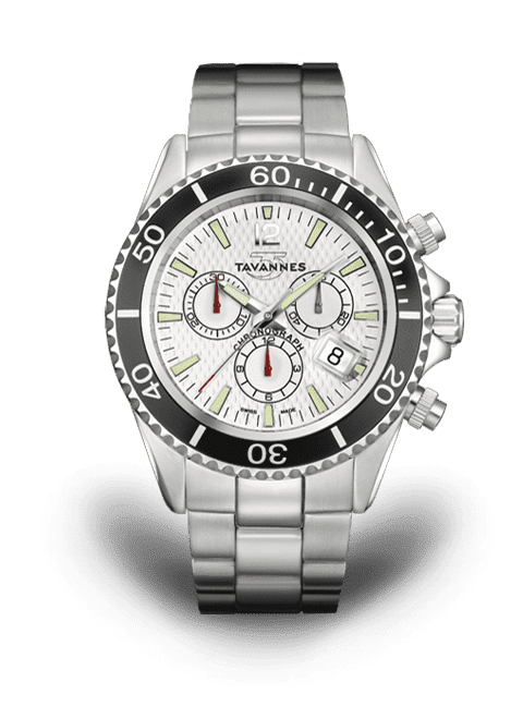This Tavannes men’s watch features a unique white CARBON dial with luminescent Superluminova applied to the indexes and hands, a stainless steel case, a black rotating bezel, a magnified date display at 4 o’clock, scratch resistant and anti-reflective sapphire crystal, screw-down crown and pushers, a stainless steel bracelet with security buckle and extension for a divers suit, a Swiss Quartz Chronograph movement for unsurpassed precision, professional water resistance to (20 ATM / 200 meters / 660ft).