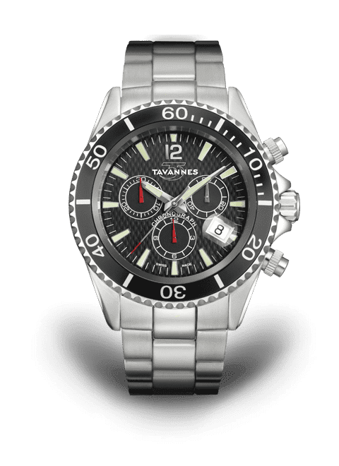 This Tavannes men’s watch features a unique black CARBON dial with luminescent Superluminova applied to the indexes and hands, a stainless steel case, a black rotating bezel, a magnified date display at 4 o’clock, scratch resistant and anti-reflective sapphire crystal, screw-down crown and pushers, a stainless steel bracelet with security buckle and extension for a diver’s suit, a Swiss Quartz Chronograph movement for unsurpassed precision, professional water resistance to (20 ATM / 200 meters / 660ft).