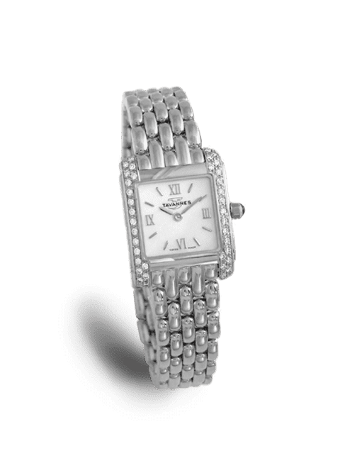 Simple elegance dazzles from the face of the Eternal Ladies collection. This beautiful Tavannes Women s timepiece features a 18k wite Gold case and bracelet (57.0 gr), Dazzling diamond bezel set with 38 diamonds (0.38 ct), Mother-of-Pearl dial set with Roman Numeral markers, Scratch Resistant Sapphire Crystal and Swiss Quartz movement for unsurpassed precision.