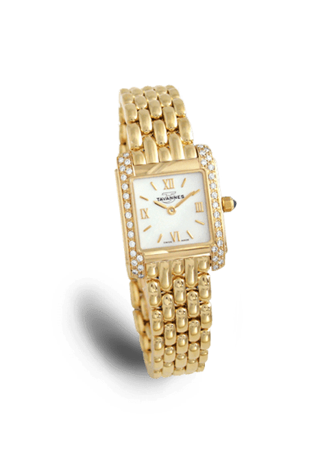 Simple elegance dazzles from the face of the Eternal Ladies collection. This beautiful Tavannes Women s timepiece features a 18k yellow Gold case and bracelet (58.0 gr), Dazzling diamond bezel set with 38 diamonds (0.38 ct), Mother-of-Pearl dial set with Roman Numeral markers, Scratch Resistant Sapphire Crystal and Swiss Quartz movement for unsurpassed precision.
